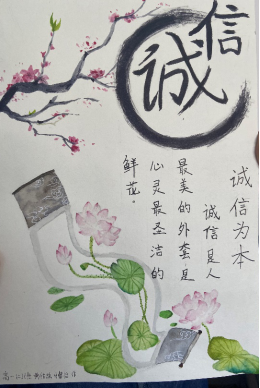 班会课中,学生依次与大家分享诚信故事。王在晴同学与大家分享了浙江“90岁老太十年还清2077万欠款”的故事。号召大家学习老奶奶诚信做人,几十年如一日坚守自己本心的精神。王超同学与大家分享了一则寓言故事,说明了人无诚信,开心会变短暂,金钱与地位也会拂袖而去。沈俊杰同学与大家分享了一诺千金的成语故事。从积极正面角度,告诉大家人若讲诚信,则会得到大家的帮助。